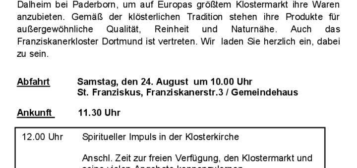 Am 24./25. August findet in Kloster Dalheim Europas größter Klostermarkt statt, bei dem u.a. das Franziskanerkloster Dortmund vertreten ist. Wir laden am Samstag, 24. August zu einer Gemeinde-Fahrt zum Klostermarkt ein. Die Abfahrt ist um 10.00 Uhr ab St. Franziskus, die Rückkehr gegen 19.00 Uhr. Die Kosten von 30,- € für Busfahrt und Eintritt werden...