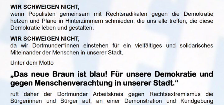 Unter dem Motto “Das neue Braun ist blau! Für unsere Demokratie und gegen Menschenverachtung in unserer Stadt.” ruft der Dortmunder Arbeitskreis gegen