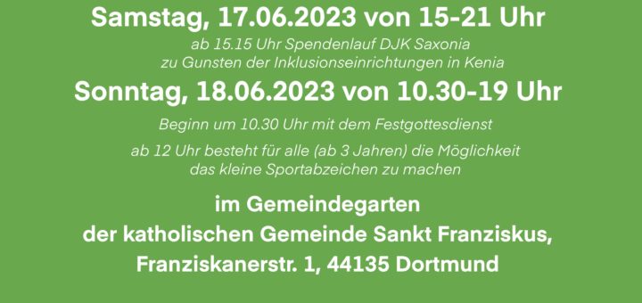 Das diesjährige Gemeindefest in St. Franziskus findet vom 16. – 18. Juni statt. Es beginnt bereits am Freitag von 18 – 21 Uhr mit einem Dämmerschoppen. Am Samstag findet es von 15 – 21 Uhr statt. Am Sonntag beginnt es mit dem Festgottesdienst um 10.30 Uhr und endet um 19 Uhr. Die DJK Saxonia ist...