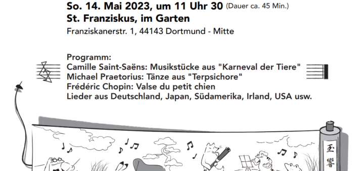 Am Sonntag, 14. Mai laden wir nach dem Hochamt in der Kirche, also um 11.30 Uhr, zu einem Konzert in den Klostergarten von St. Franziskus ein. Das japanische Musikerinnen-Trio „La Perla – Tamayura“ singt und spielt u.a. aus dem „Karneval der Tiere“ von Camille Saint-Saëns. Das Konzert ist geeignet für Erwachsene und Kinder. Der Eintritt...